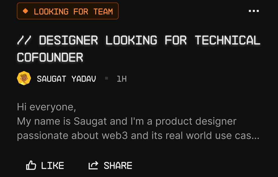 Colosseum hosts two online hackathons per year, as well as the perpetual Eternal challenge.Builders can sign up on our platform to create a profile, match with cofounders, discuss product ideas in the forum, and compete.